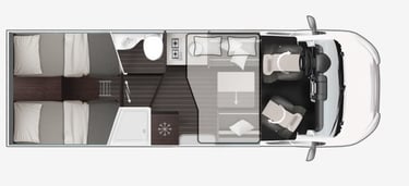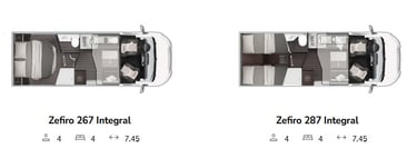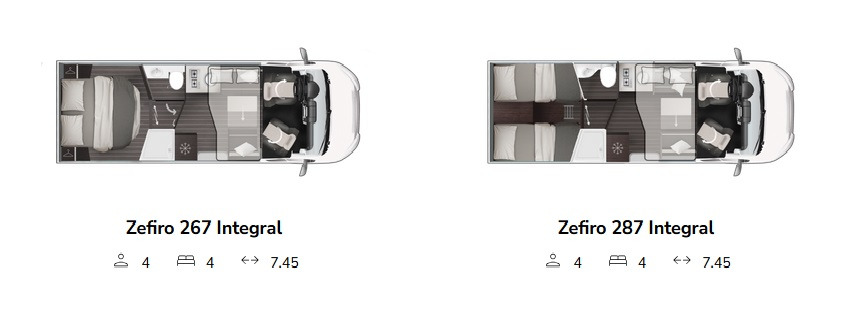 Zefiro 287TL Integrala - Autorulota pentru cei care caută mult spațiu, zone separate și capacitate mare de depozitare. Paturi twin și toaletă separată cu compartiment de duș separat.