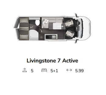 Noul LIVINGSTONE 7 ACTIVE, conceput pentru echipaje numeroase, are cinci paturi de dormit și un acoperiș rabatabil în dotarea standard. Dineta MAXI este dezvoltată în lungime, cu o masă pliabilă rotativă și mobilă. Zona toaletei și a dușului sunt separate printr-un pasaj. Baia are uși duble, una către dinetă și una către zona de dormit, care, atunci când sunt închise, creează o baie/dressing spațioasă.
