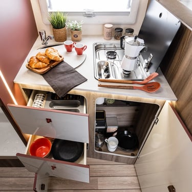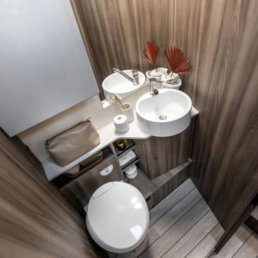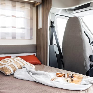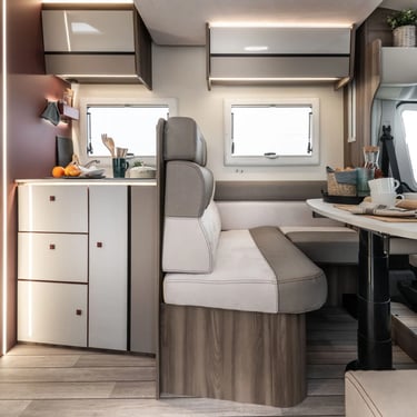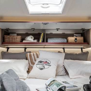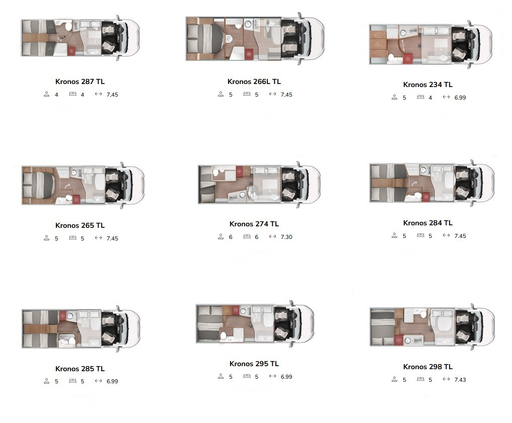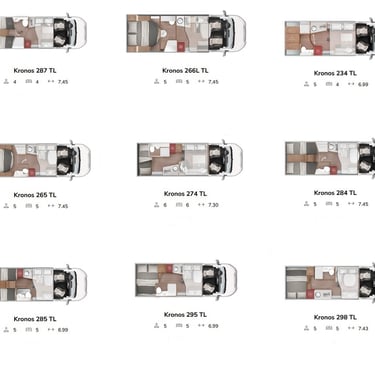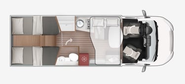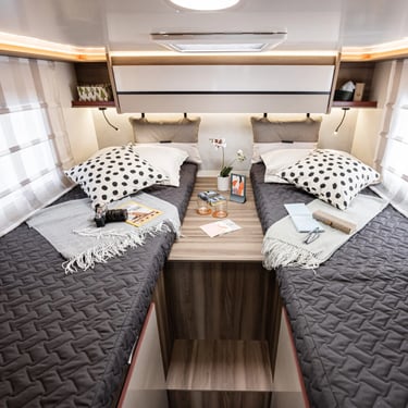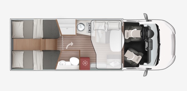 Kronos 284 TL - Cameră compactă pentru cei care caută spații mari, cu paturi twin în spate care se transformă într-un pat dublu maxi, pat rabatabil electric și zonă separată de toaletă/duș.