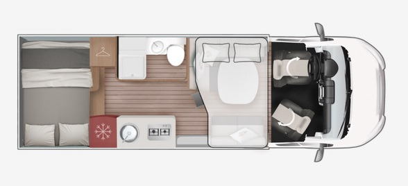 Kronos 298 TL - Modelul ideal cu profil redus pentru cei care au nevoie de spații mari și spațioase. Cu pat în garajul din spate și baie cu toaletă și duș separate.