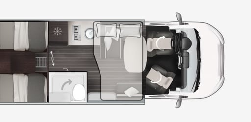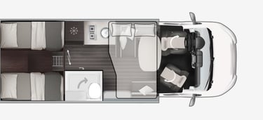 Zefiro 285TL - pentru familia care caută spațiu și spațiu de depozitare. Cu paturi twin în spate care se transformă într-un pat dublu maxi și toaletă cu volum variabil.